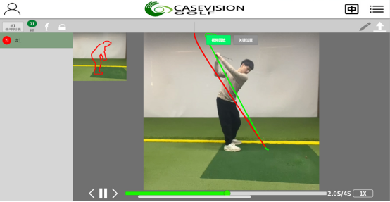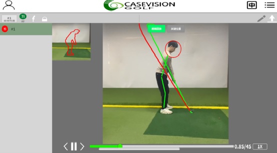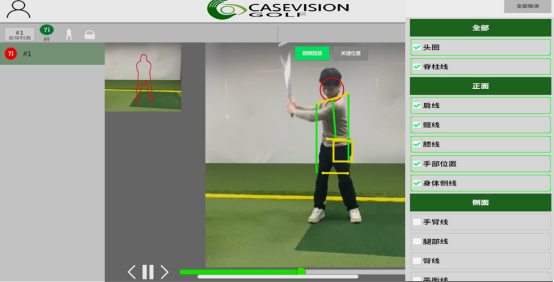 (4)智能画线:这个功能彻底结束了繁琐耗时不精确的人工画线,球员通过点击方式,即可选择画出头部位置、脊柱线、肩线、髋线、膝线、手部位置、身体侧线、手臂线、腿线、臂线、平衡线、挥杆平面。练习者可以根据这些参考线,对挥杆动作进行分析评估。