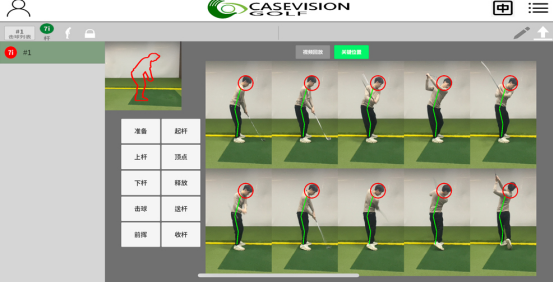 (3)自动识别关键位置:准备、起杆、上杆、顶点、下杆、释放、击球、送杆、前挥、收杆。练习者可以不看视频只看关键位置时的图片,也可以选定只看某一关键位置(如上杆最高点)的图片,这样每挥一杆,屏幕自动显示选定位置(如上杆最高点)时的图片或所有关键位置的图片,实现快速反馈。节省球员时间,不影响挥杆节奏。