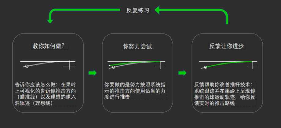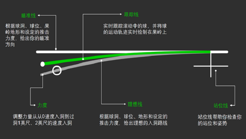 直接将球的滚动路线实时投影到果岭上,您就可以将其与瞄准线理想线进行比较,发现不足。大量实践表明,这种直接反馈有助于选手改善推击技术、增强肌肉记忆、消除错误来源。